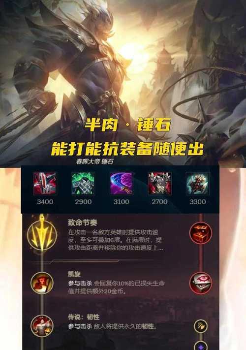 英雄联盟是一款团队合作竞技游戏,其中有许多不同类型的英雄可以选择。而在游戏中,有一种战士角色,即半肉型英雄,他们在防御和输出之间找到了平衡。本文将针对最新版本的英雄联盟,为大家介绍一些半肉出装攻略,帮助玩家打造坚韧输出的战士。